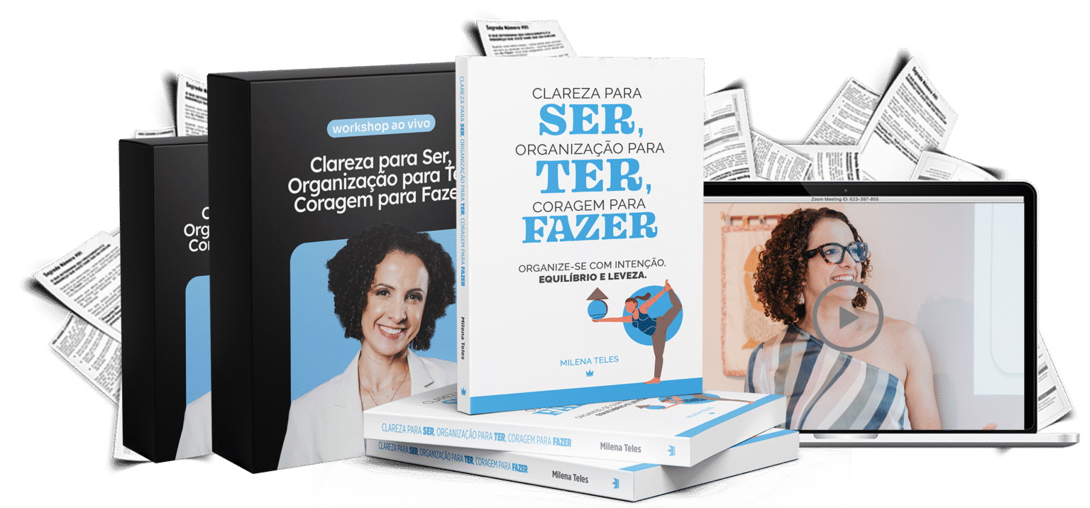Ao participar do meu workshop, você vai receber na sua casa meu livro impresso: Clareza para Ser, Organização para Ter, Coragem para Fazer – Organize-se com intenção, equilíbrio e leveza. Com frete grátis para todo o Brasil.